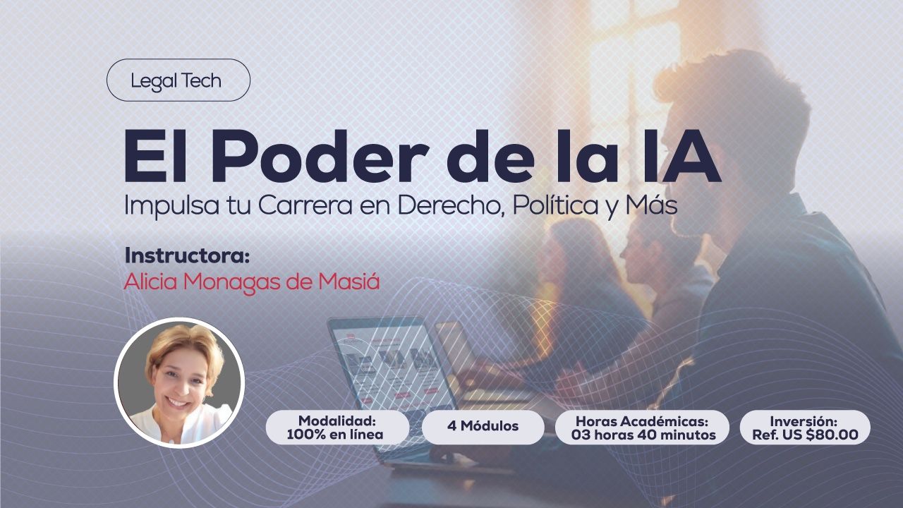 SOBRE EL CURSO: Este curso de Legal Tech, "El Poder de la IA: Impulsa tu Carrera en Derecho, Política y Más," te brindará las técnicas y herramientas prácticas para dominar la Inteligencia Artificial generativa y aplicarla a tu profesión. Aprenderás a optimizar tus procesos de investigación y análisis de información drásticamente, a acelerar la redacción y el resumen de documentos extensos y a utilizar herramientas clave como ChatGPT, Gemini, Perplexity y NotebookLM.